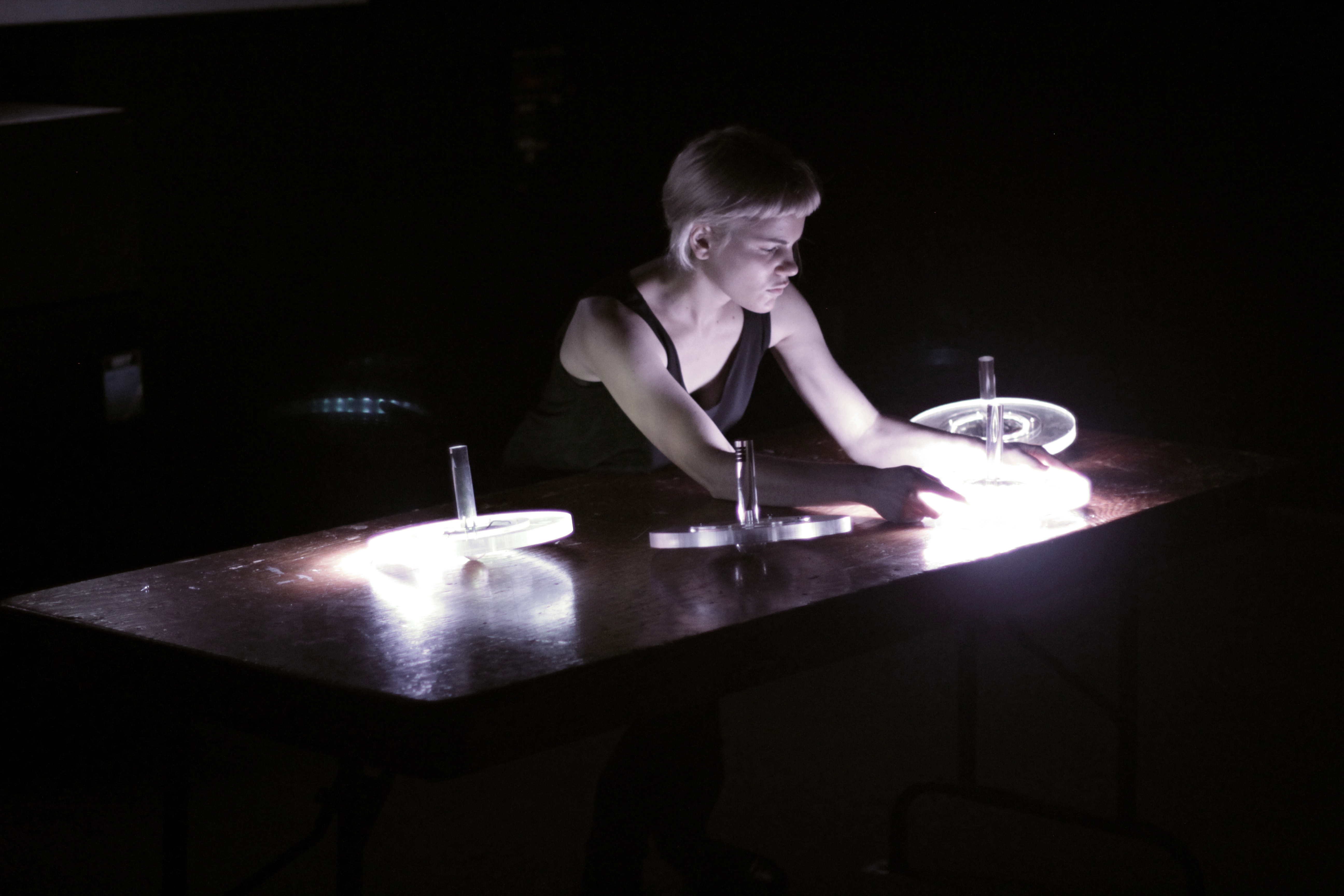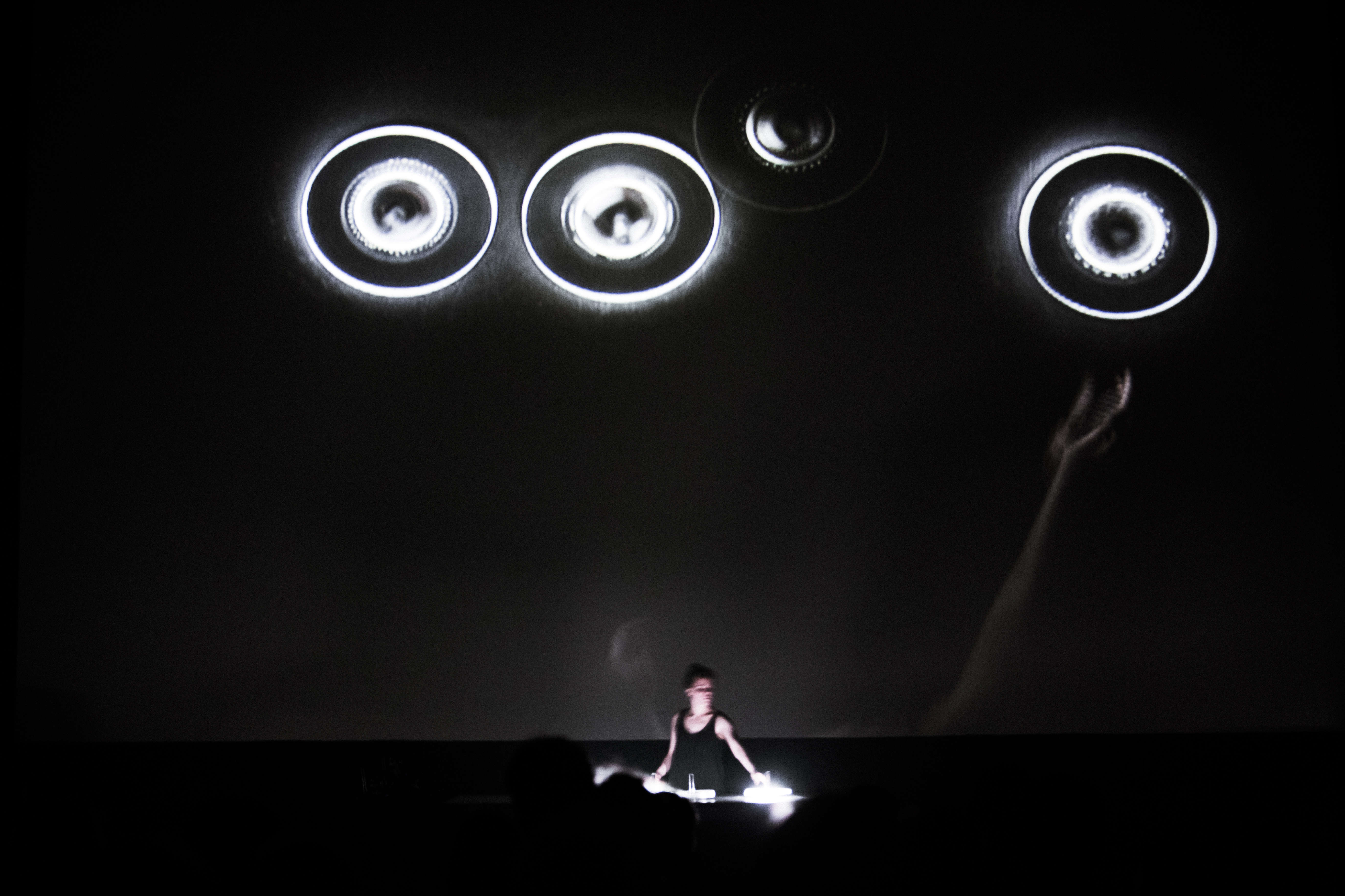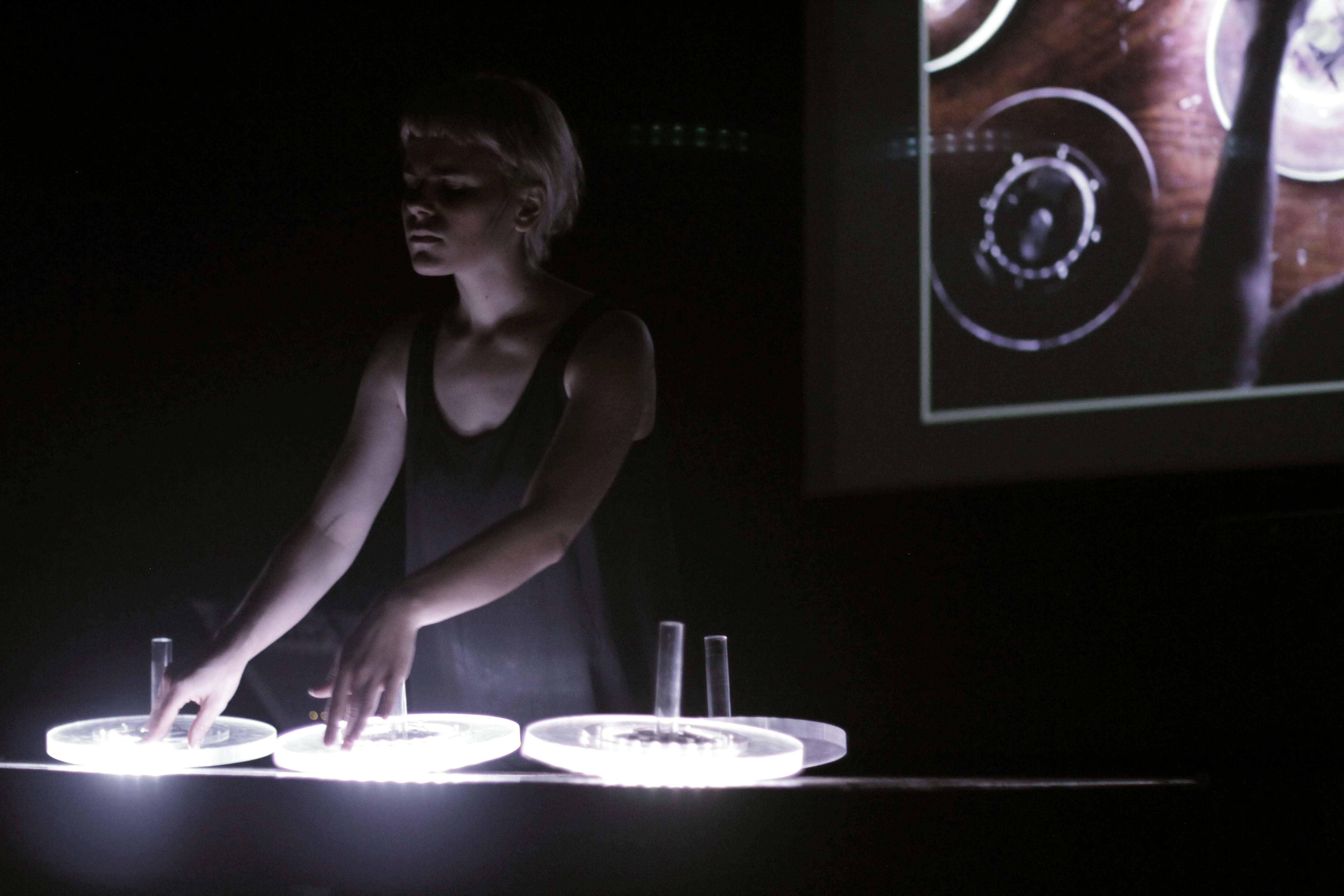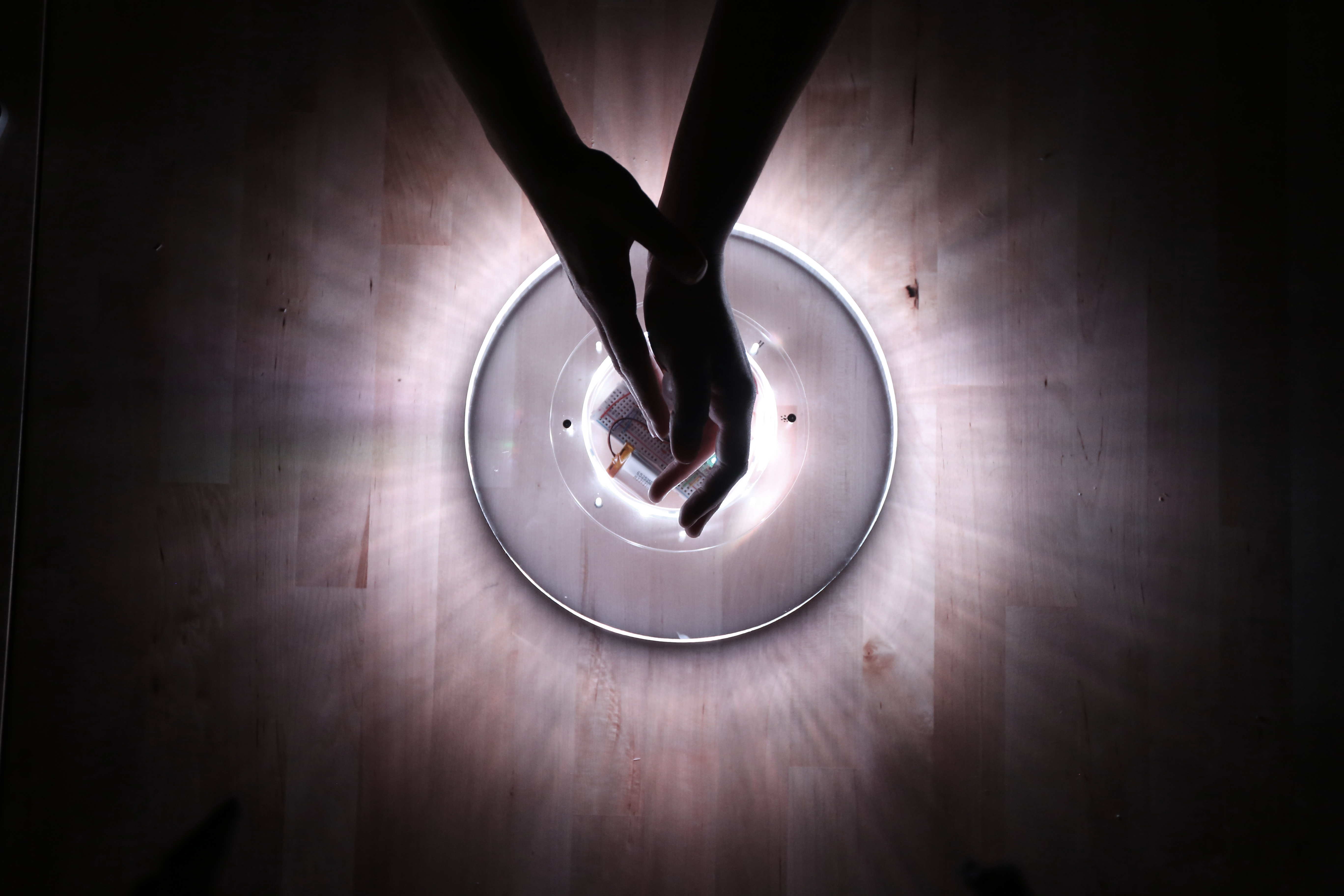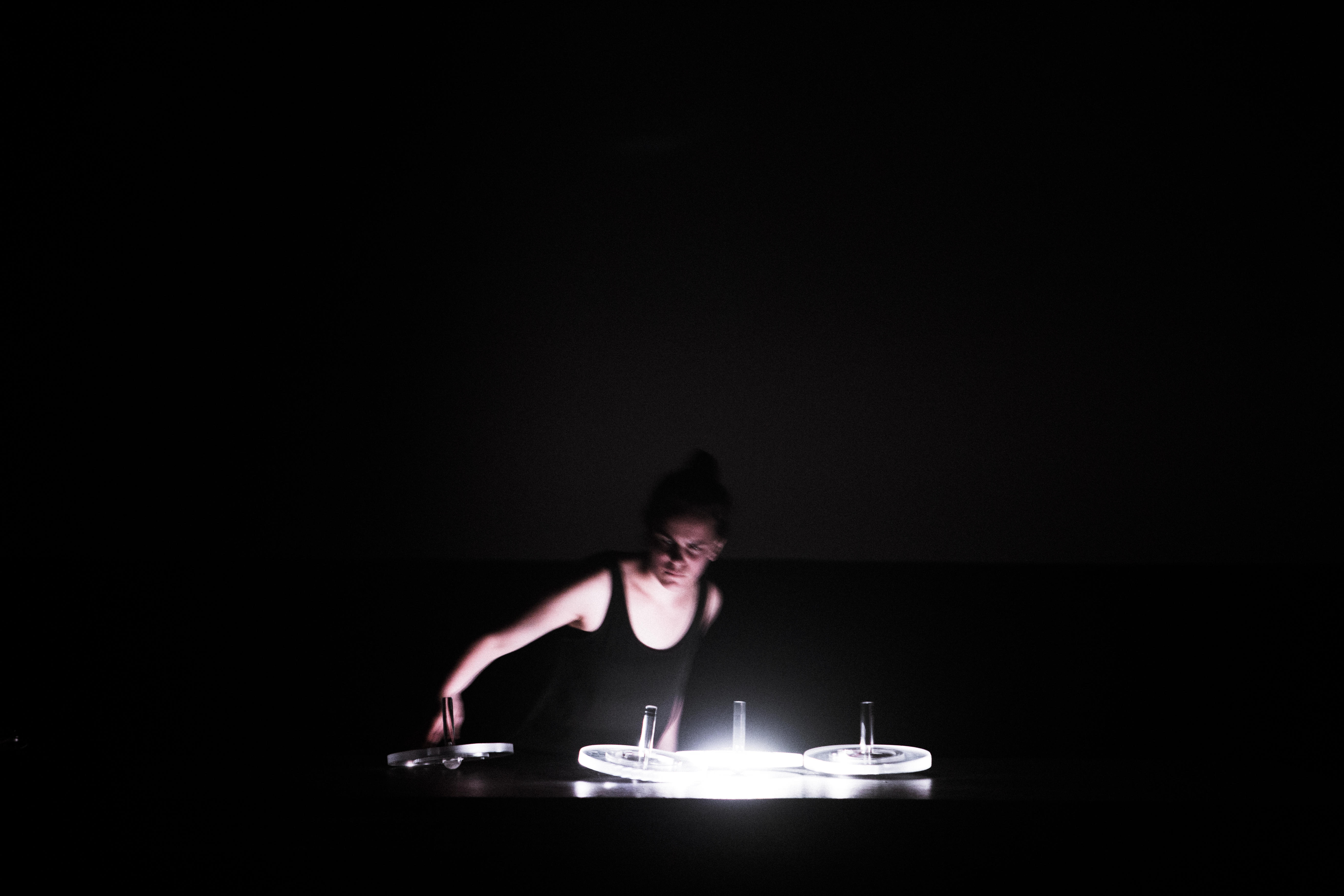 Soft Revolvers is an audiovisual performance for 4 spinning tops built with clear acrylic by the artist. Each top is associated with an ‘instrument’ in an electronic music composition and the motion data collected by sensors – placed inside the tops – informs musical algorithms. With their large circular spinning bodies and their role as music playing devices, the interfaces strongly evoke turntables and DJ culture, hip hop and dance music. LEDs placed inside the tops illuminate the body of the objects in a precise counterpoint to the music, creating stunning spinning halos.